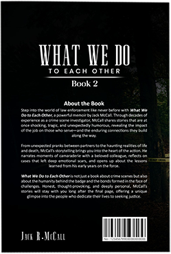 Welcome to the official website of Jack R. McCall, the author of ‘What We Do to Each Other’. Jack shares powerful real-life stories from his years as a crime scene investigator, offering a rare look into the world of law enforcement. If you’re looking for a compelling read that blends true crime with human connection, you’re in the right place. Explore the book, learn more about Jack, and stay connected for updates!